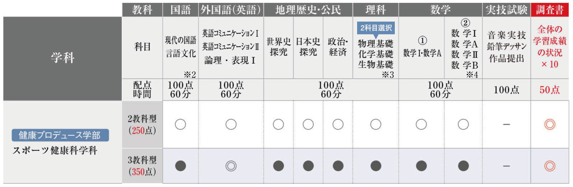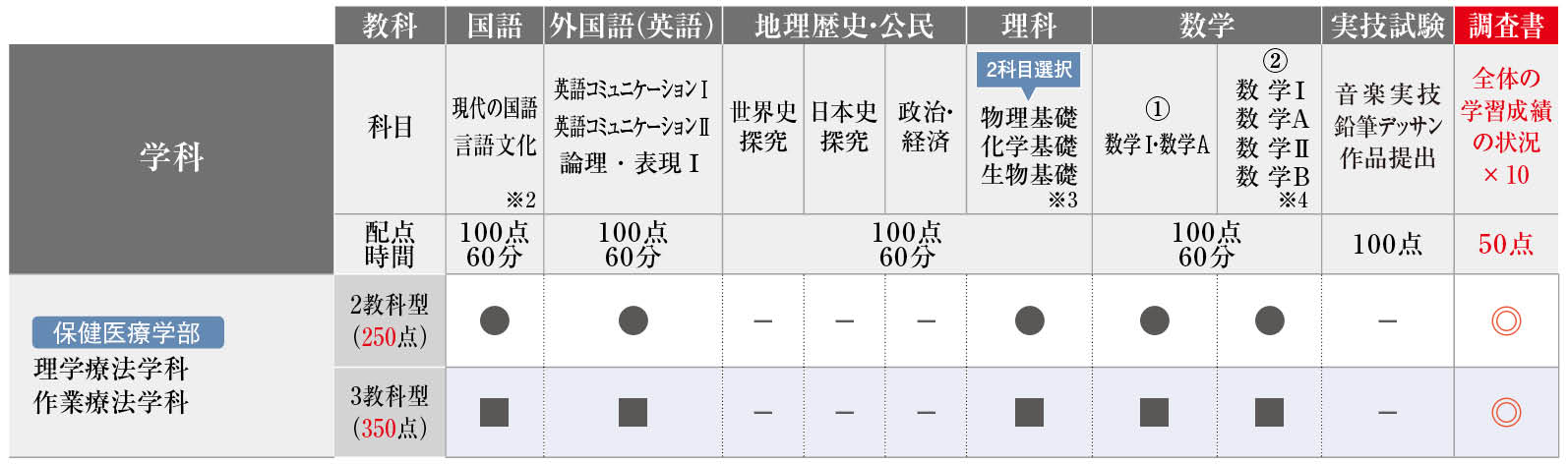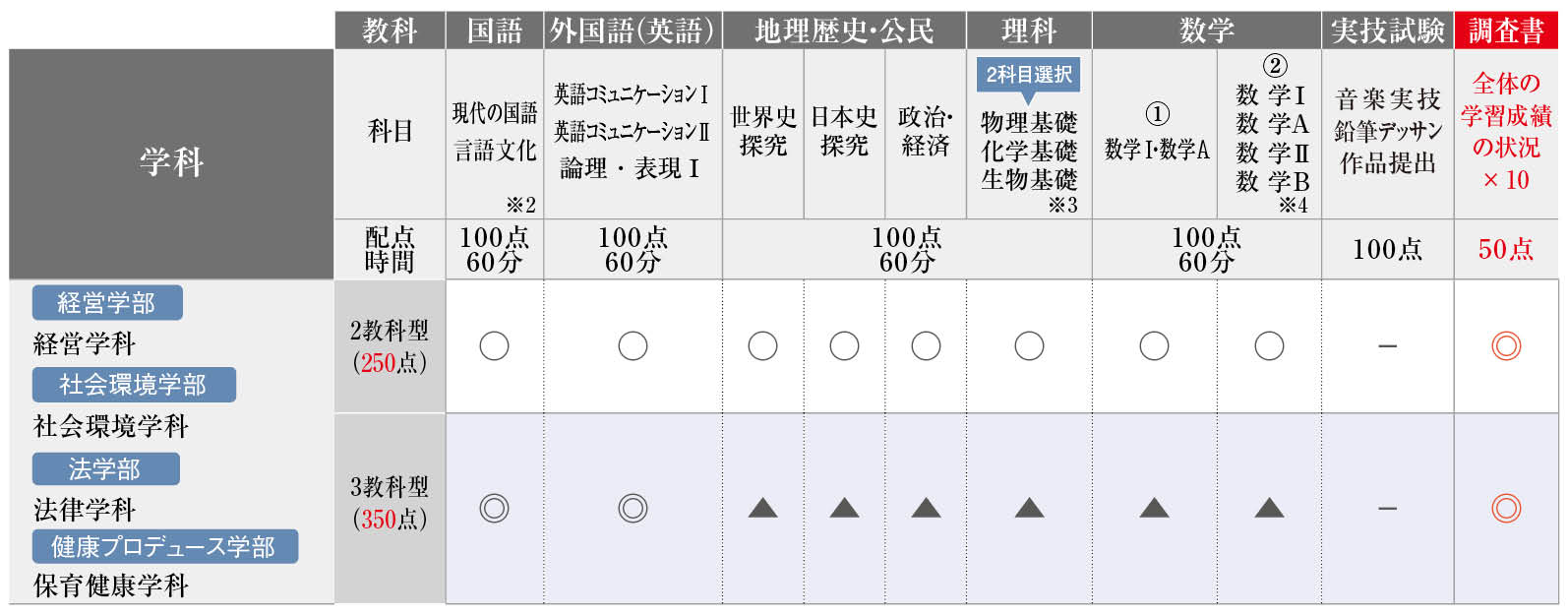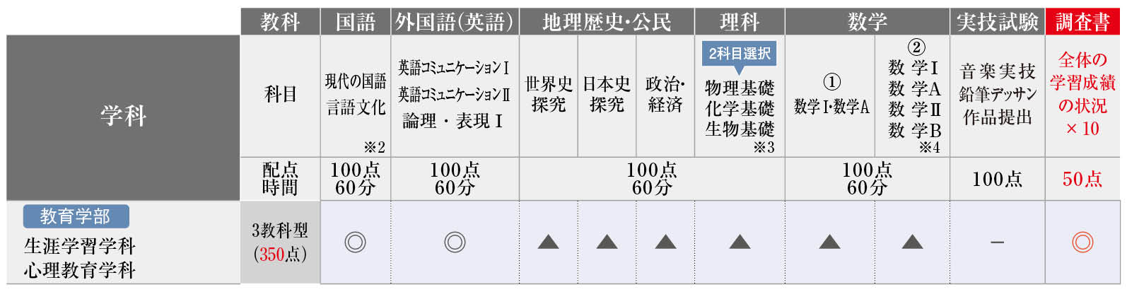 ○ :2教科2科目選択〔国語・外国語(英語)いずれか1教科を含むこと〕
