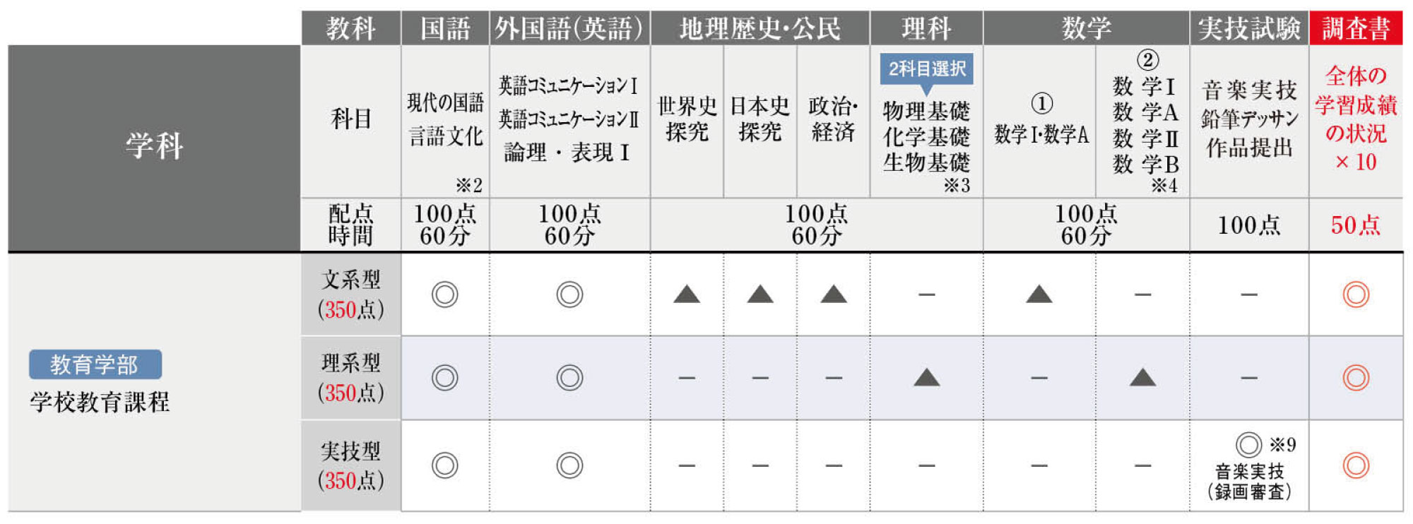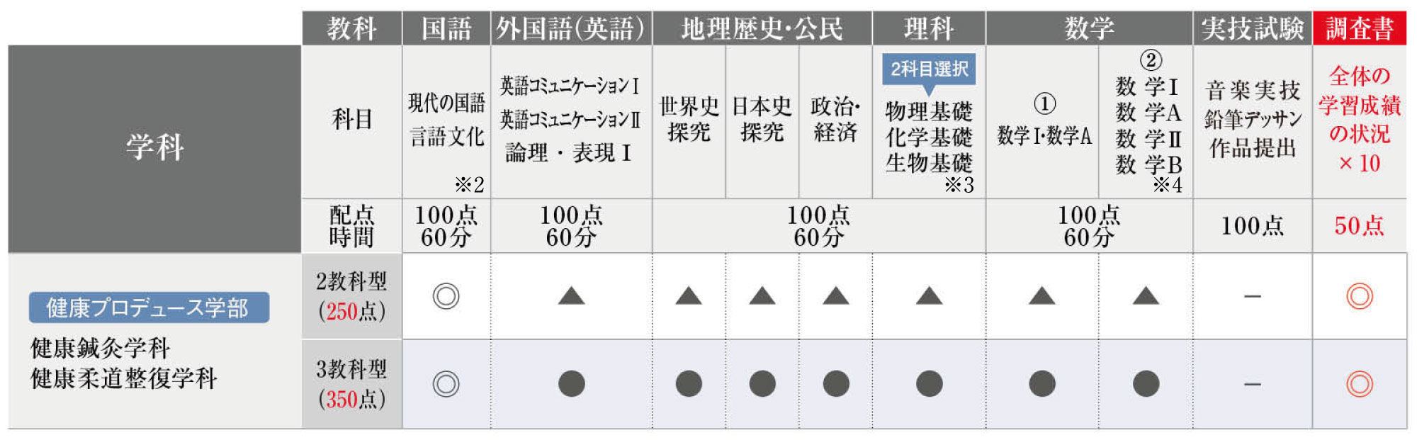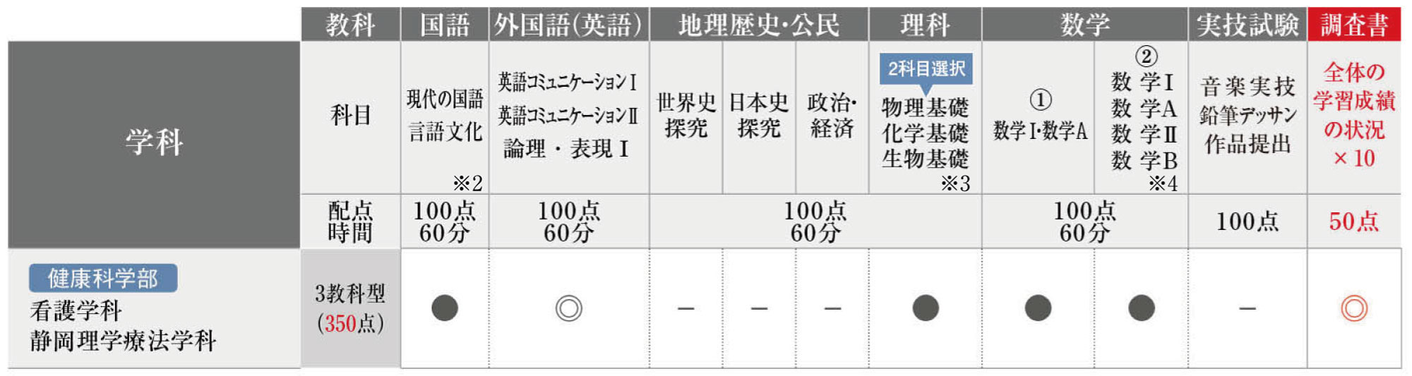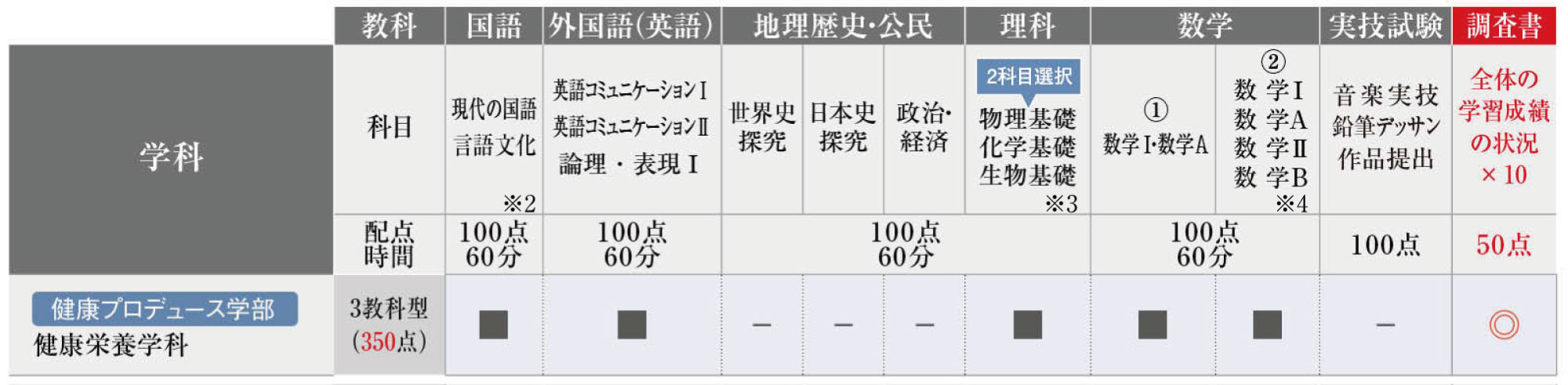 ○ :2教科2科目選択〔国語・外国語(英語)いずれか1教科を含むこと〕