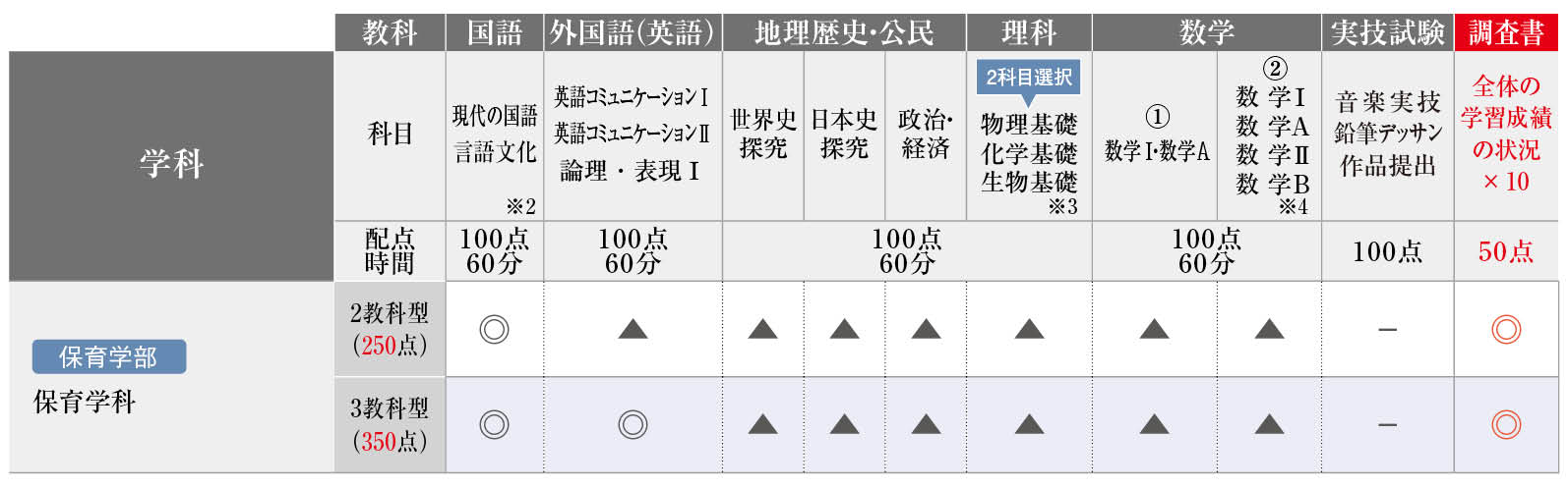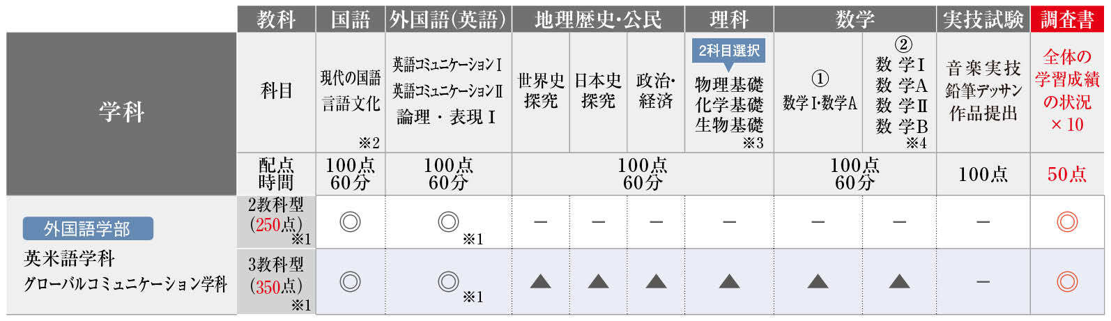 ※1 外国語学部英米語学科のみ外国語(英語)を200点満点に換算し、2教科型(350点)、3教科型(450点)とします。
