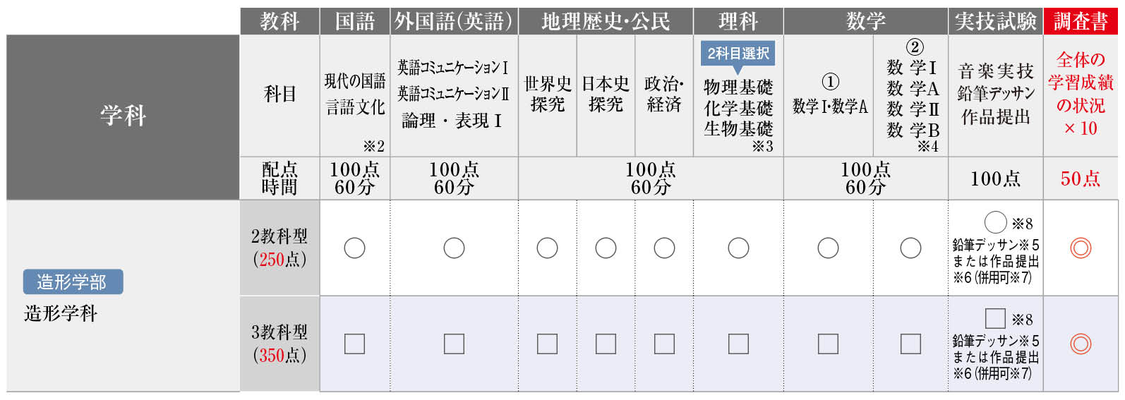 ※8 造形学部志願者で実技試験を選択する場合は、実技試験の受験方法を「A.鉛筆デッサン」「B.作品提出」「C.鉛筆デッサン+作品提出」から選択してください。