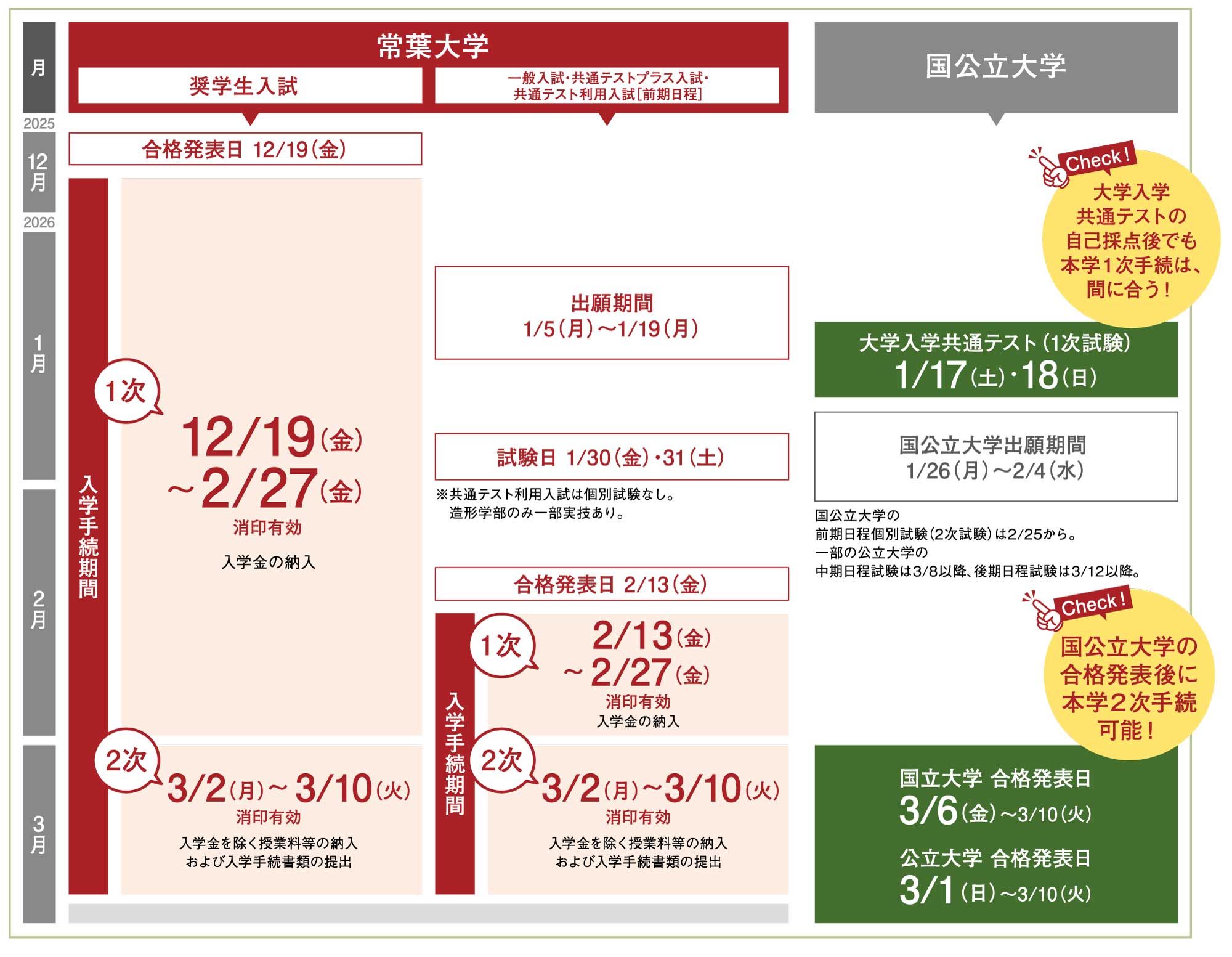 1次手続の締め切りは、2026年2月27日(金)消印有効です。大学入学共通テストの自己採点、他大学の入試(前期日程等)結果を待った上で、手続が可能です。